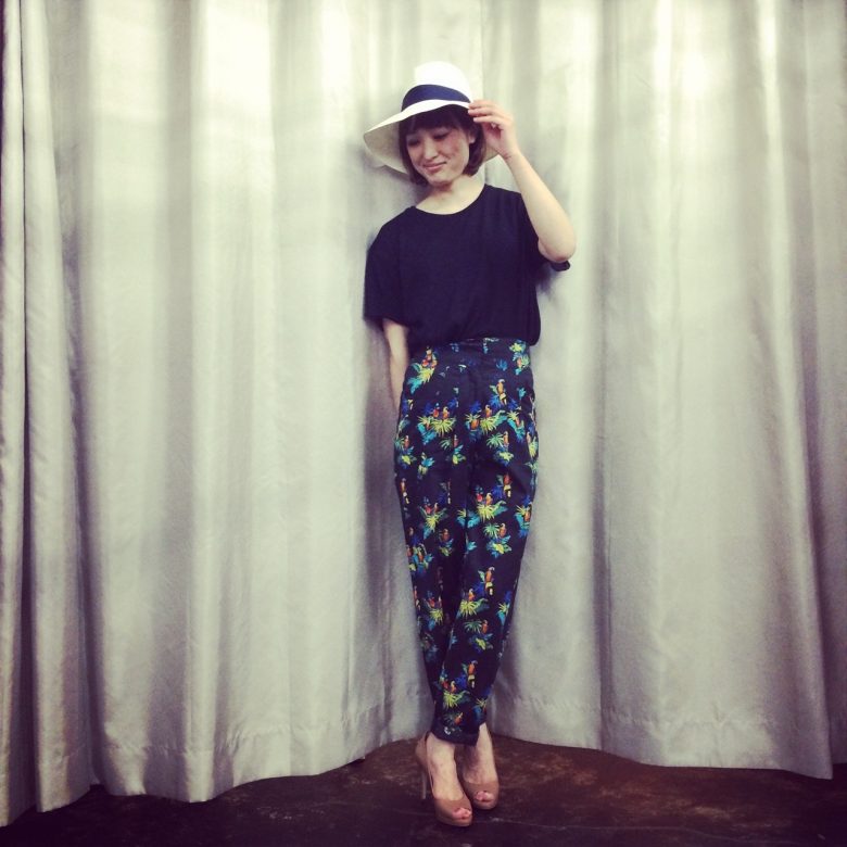 リゾートテイストな柄パンツにはヒールとハットで女度アップ♪