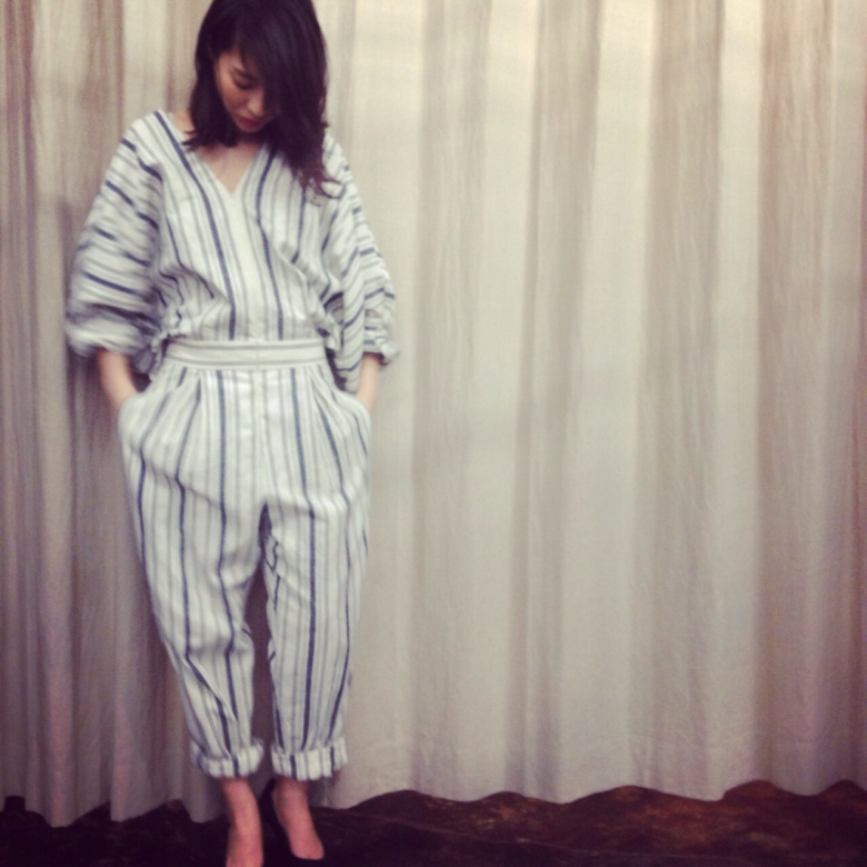 リネン特有の抜け感とストライプのカラー使いが大人な雰囲気を出してくれるオールインワン。