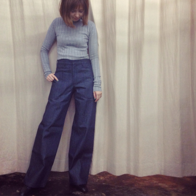 リブニットに存在感のあるデニムパンツを合わせ、シンプルなスタイリングを楽しんで。