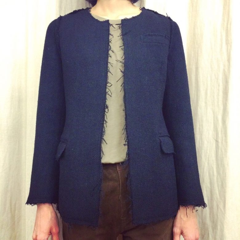 ヴィンテージの生地を使用し、シルエットは女性らしく細身です。