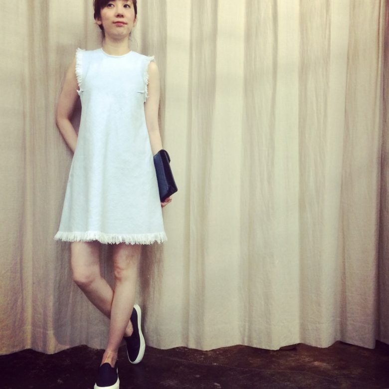 ヴィンテージ感が漂うサックスブルーのワンピース。