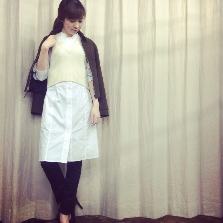 一枚で着がちなシャツワンピースもニットベストを合わせてレイヤードスタイルに♩