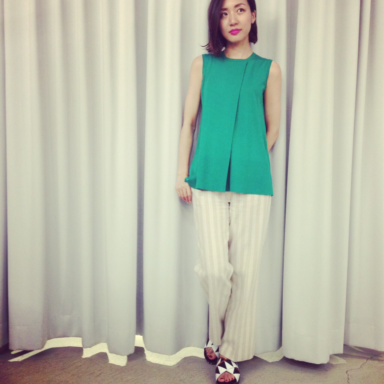 一見シンプルなトップスも、タックのラインでこなれた雰囲気に。