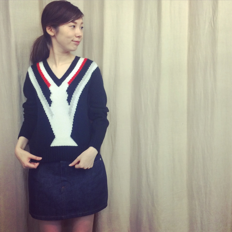 04.09.2015 今季のテーマをイメージさせる 国旗を解体したような幾何学模様は キャッチーで印象的♫ MAISON KITSUNE tops ¥42,000+tax col…black,white A.P.C skart ¥13,000+tax a.p.c. maisonkitsune