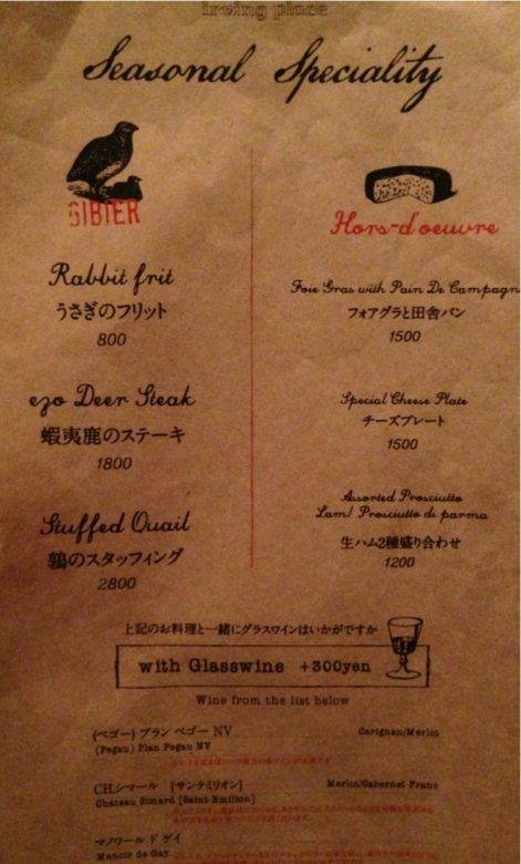 野生のお肉をirvingらしくハーブや木の実、スパイスで味付け。フランス産ワインと一緒に是非試してみて下さい