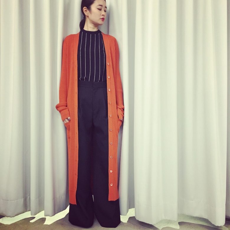 全体的にビックシルエットにまとめたバランスは、ストライプを効かせてスッキリと。