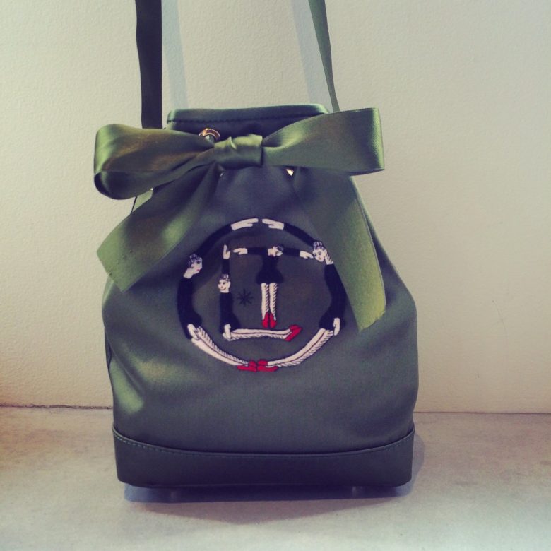 刺繍のバレリーナが施され、生地の光沢感が素敵な巾着型のBAG♩