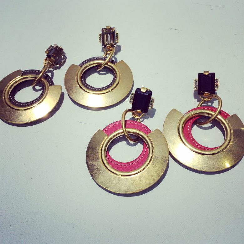 大きなビジューとレザーの異質感が楽しいイヤリング。