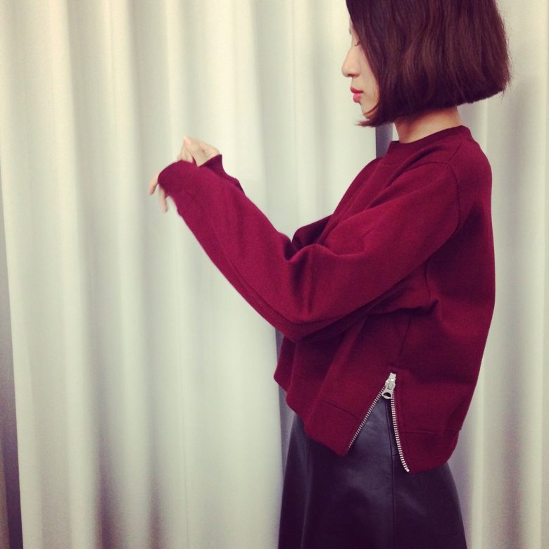定番のAcne Studiosのスウェットは秋色のチョイスで。