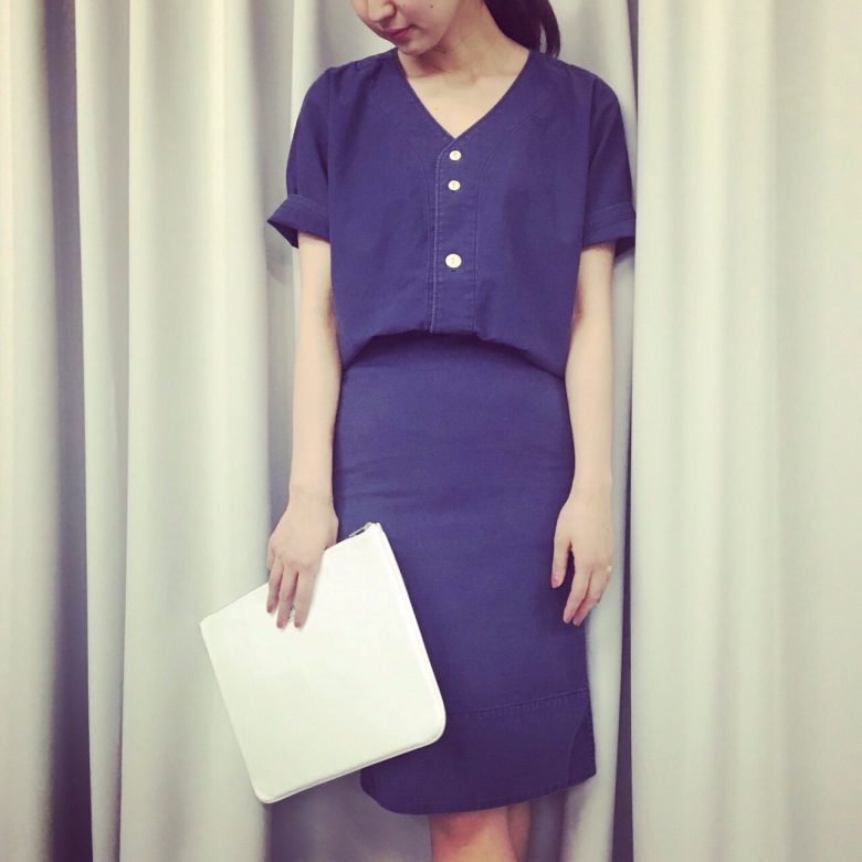 TOKYO 15.04.2016 定番素材のコットンバックサテンを使用したベースボールシャツ。フロントは首元が綺麗に見えるVネックでボーイッシュなアイテムも女性らしく。 MADISON BLUE price…¥41,000+tax color…navy,khaki 16ss madisonblue WEAR