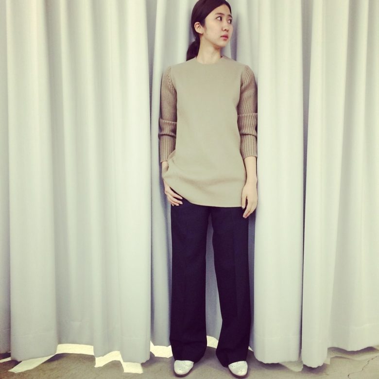 少しゆるめの身頃に、細身のリブ袖とのバランス感が新鮮な一着。