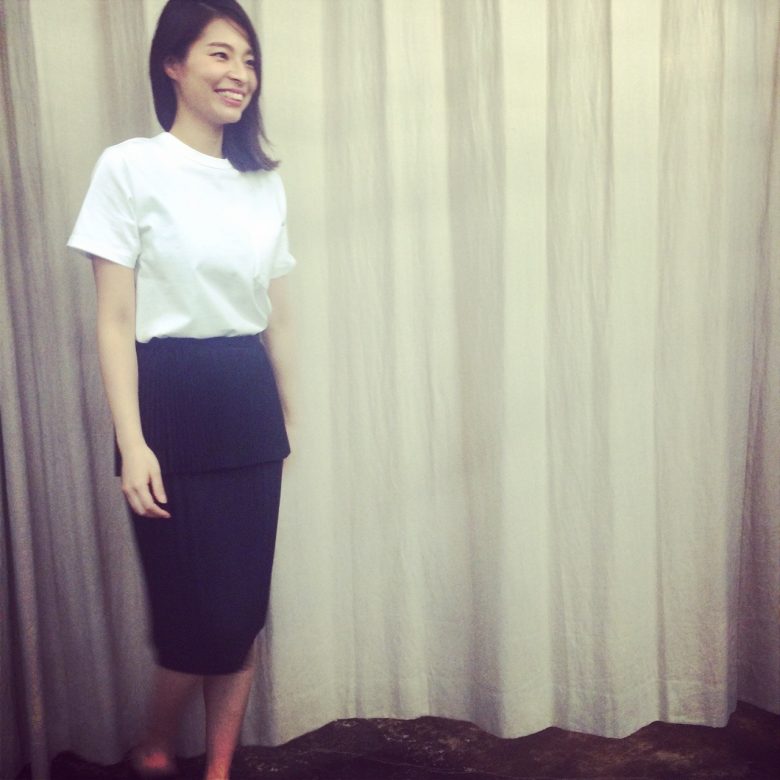 08.04.2015 幅の異なるプリーツ生地を 重ねて動きのあるデザインに。 skirt CLEANA ¥28,000+tax tops HYKE ¥12,000+tax col…white, t.gray,navy cleana