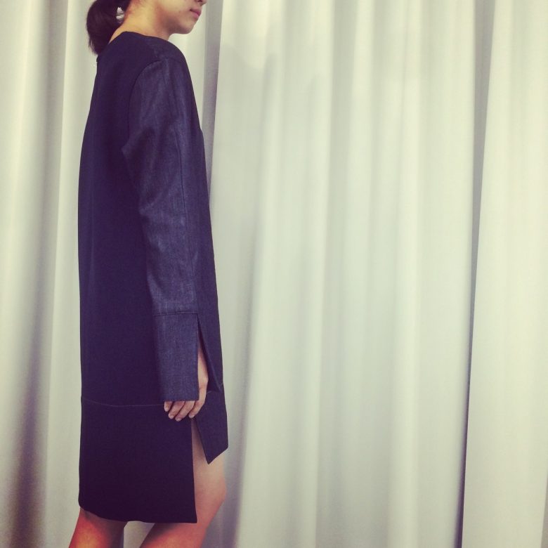後ろ身頃はカシミア混の張りのあるウール素材。異素材の組み合わせでサイドからの表情も素敵に。