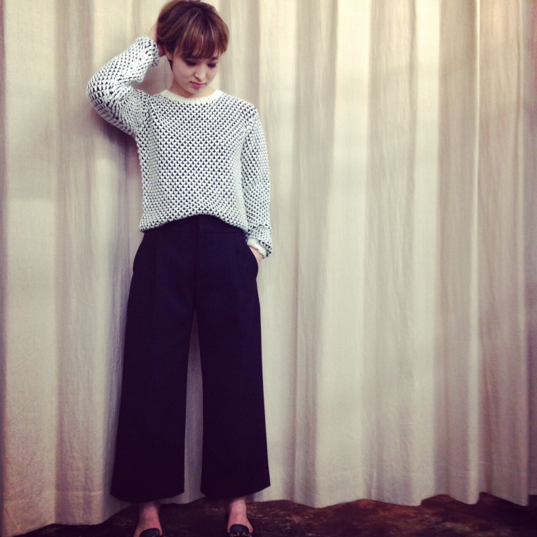モノトーンのアクセントになるザックリニットを合わせ◎