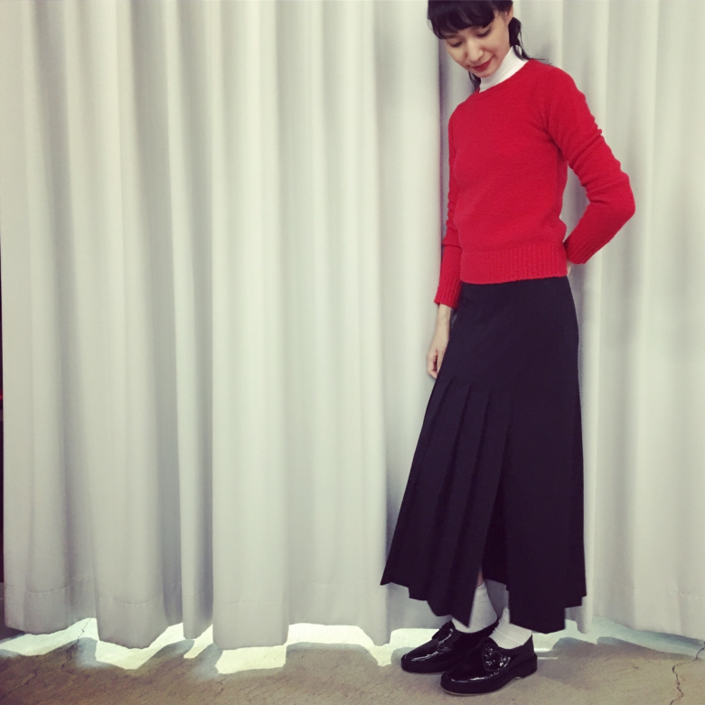 真っ赤なcolorが鮮やかなKNITはシェットランドウールのガシッとした素材感。