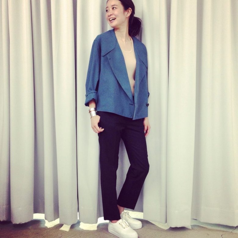 肌になじむBLUEのジャケットは女性らしいカラーのディテールもポイントに。