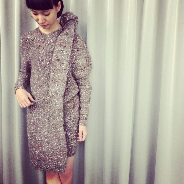 肩からかけてお使いいただけるニットトート。ベルト部分の長さは自由自在に◎