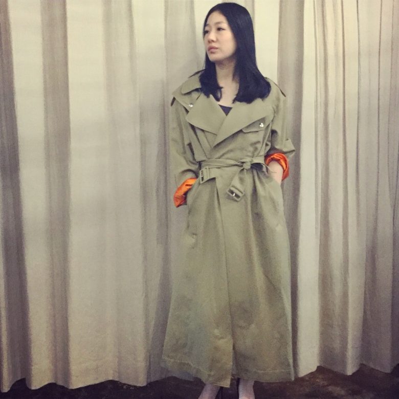肩にボリュームを出し、ウエストを絞ったトレンチスタイル。