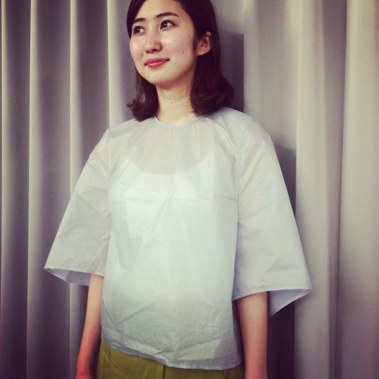 肩の落ち感から袖口の広がるバランスがとても綺麗です。ポリウレタン素材で独特の張り感、透け感があります。