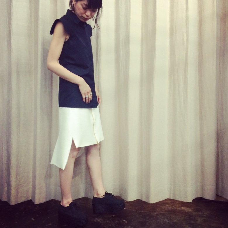 28.05.2016 膝丈スカートのトラッドなイメージを フロントのジップや長い後ろ身頃で クリーンでモードな印象に♪ skart CLEANA ¥37,000+tax 16ss cleana WEAR