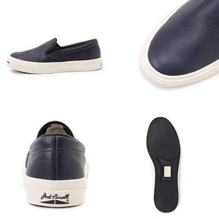 90年代に発売されビンテージ市場でも、決して多くは出回らない希少なモデル”JACK PURCELL”のスリップオン。第2弾となる今回、アッパーには高級感と耐久性のあるネイビーのスムースレザーを採用。トゥキャップのないミニマルなデザインのバランスが良く、洗練された印象のスニーカーに仕上げました。