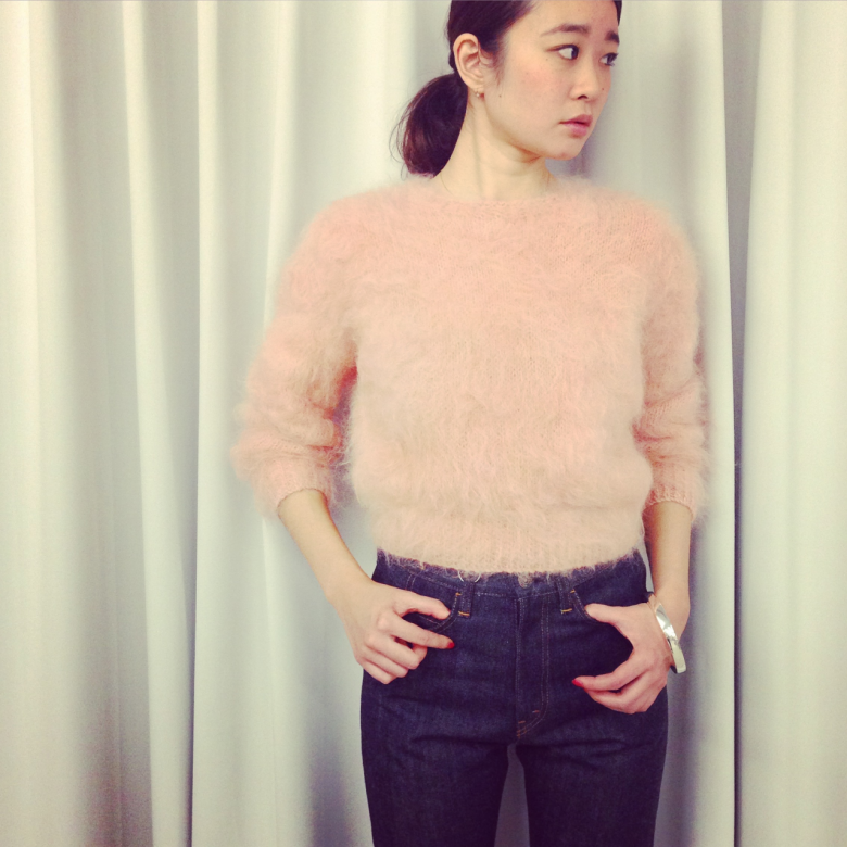 100%モヘアのニットはサーモンピンクがのカラーが美しい1枚。