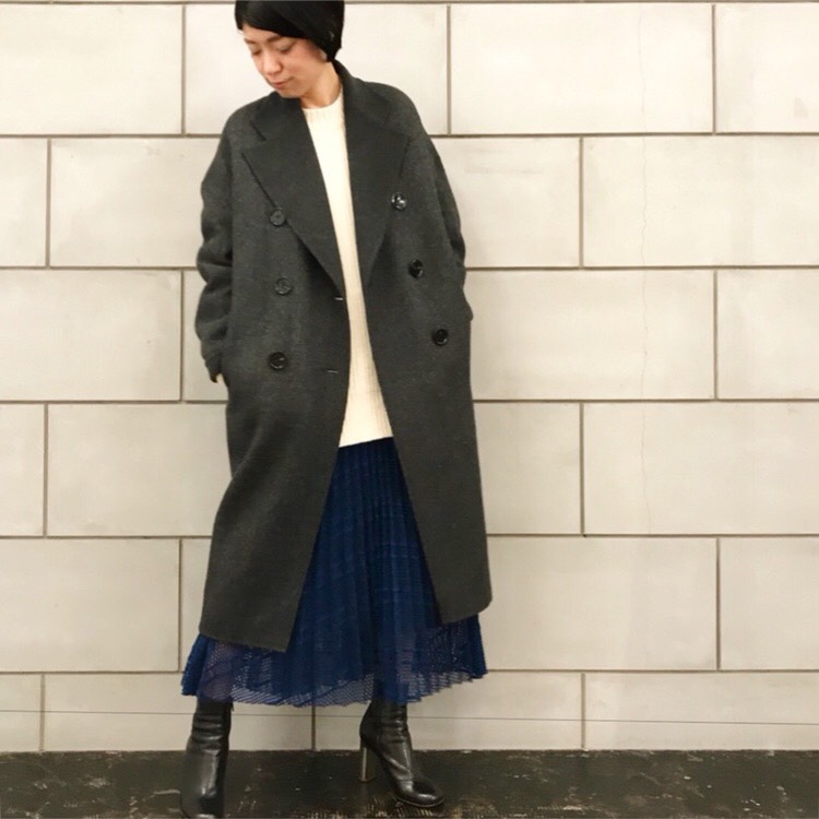 マニッシュなコートに着丈の長いボトムを合わせ、重めのバランスを楽しんで。
