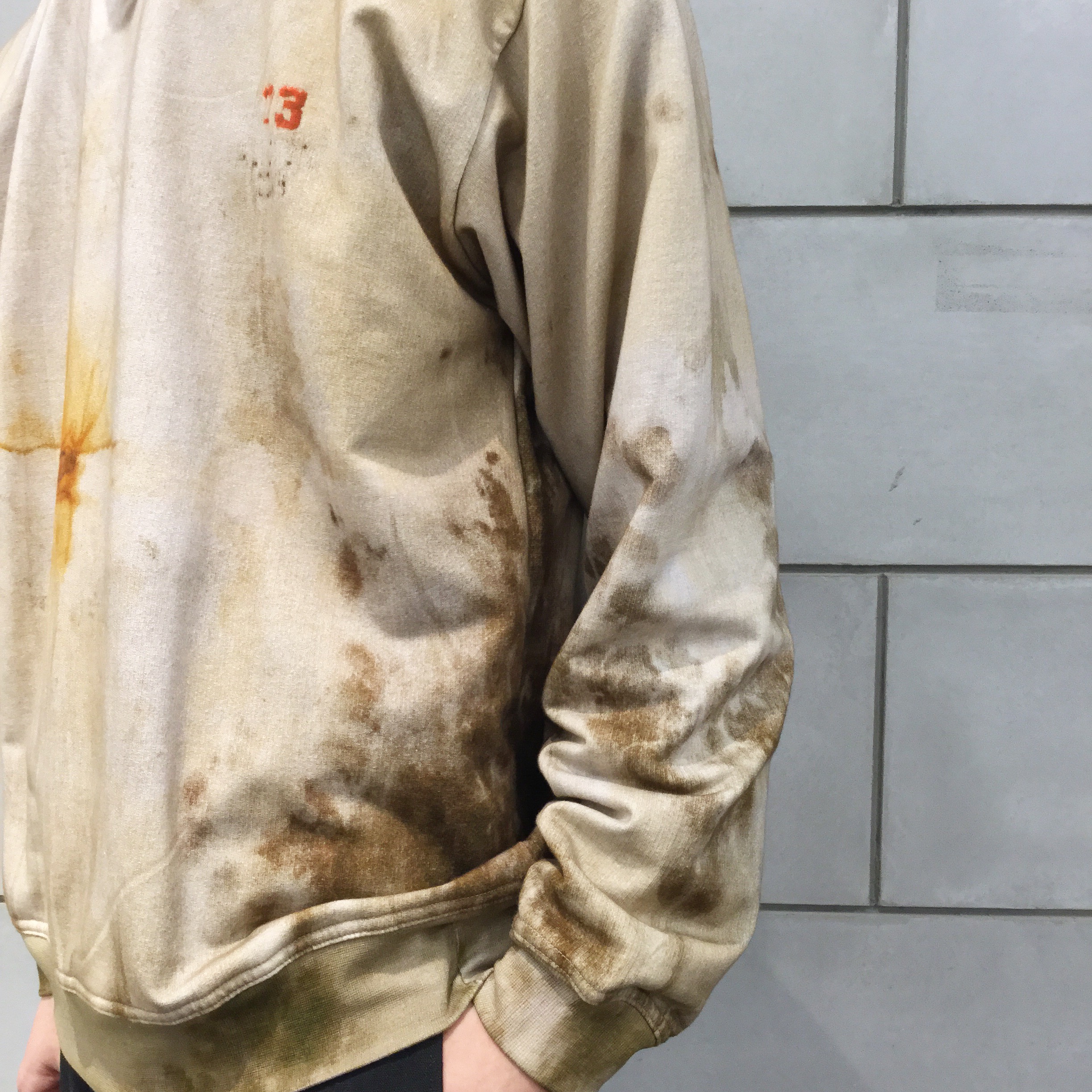 スウェットやニットをわざと燃やしたり、腐食させる等の実験的なエイジングを施した物を、新たなスウェットに転写プリントを行い、独自のアートを表現した一着。