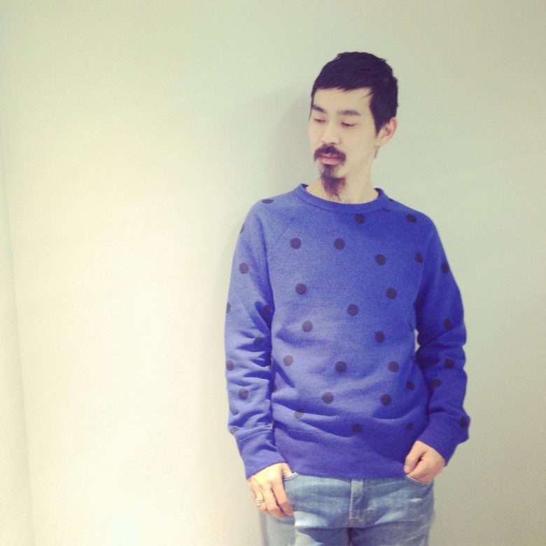 スウェットにドットのデザインが施されサイズ感はタイトめとなります。ブルーのスウェットはこれから大活躍です!