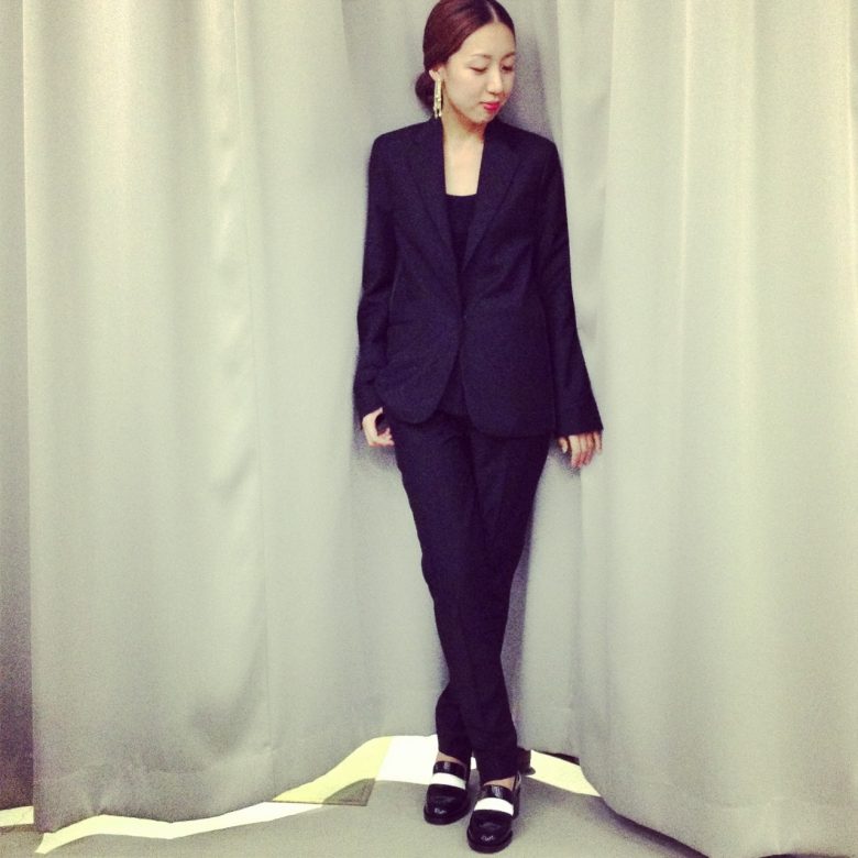 ウエストのしぼりがないジャケットとテーパードの効いた細身のパンツ。意外とないタイプのセットアップで新鮮です◎