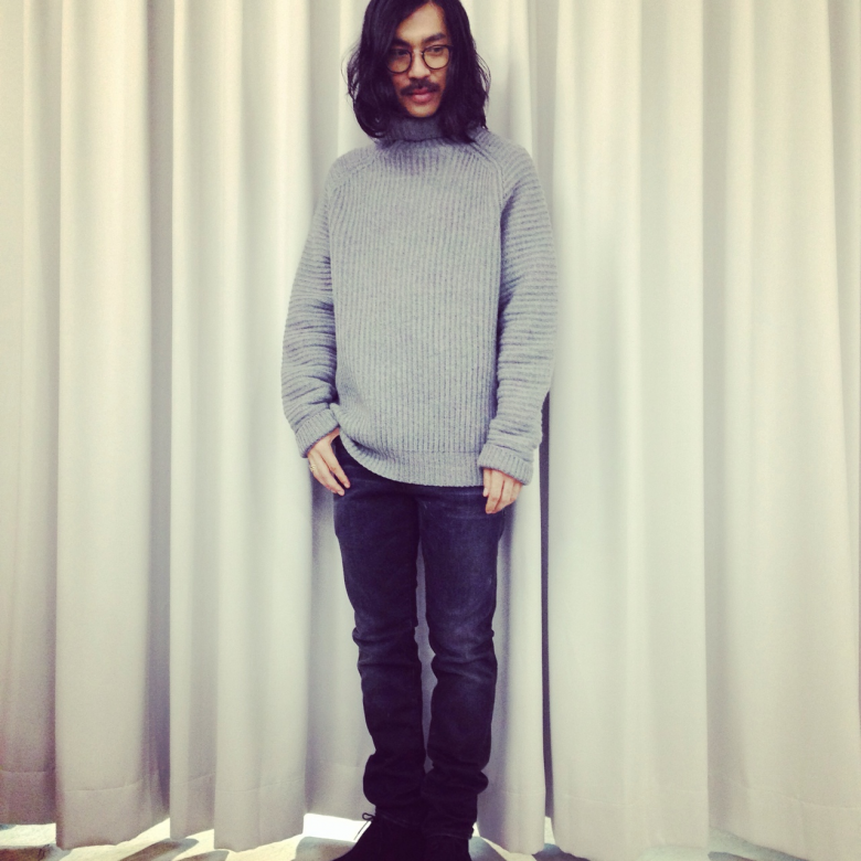 ゆとりのあるタートルネックは細身のパンツでバランスを!