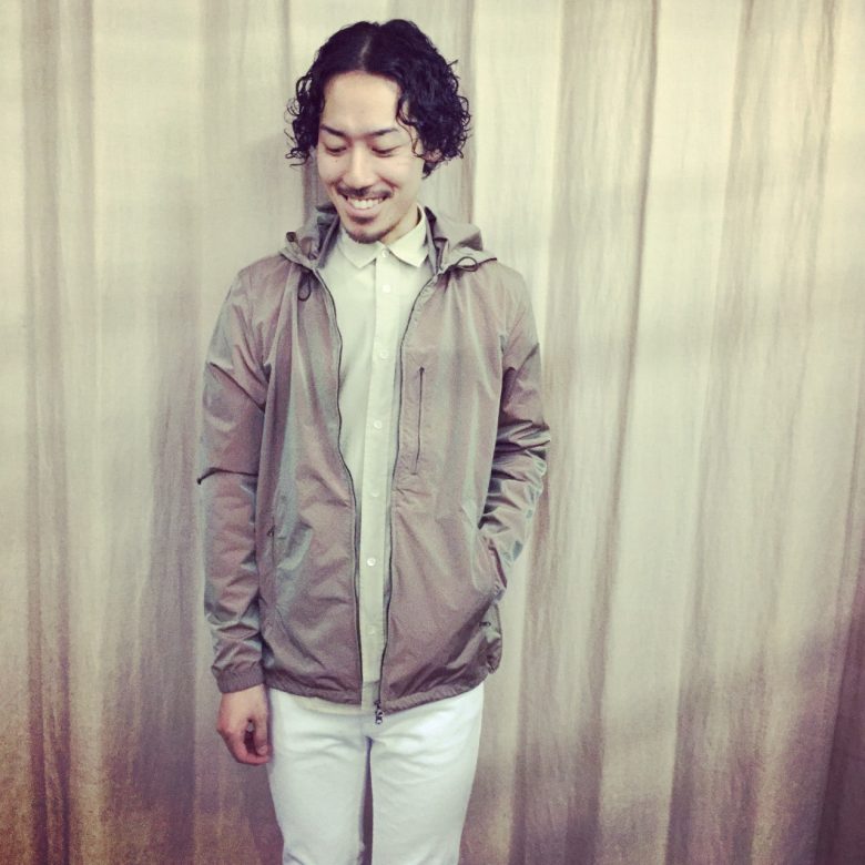 シンプルなデザインのナイロンパーカは光沢のある独特のカラーリングが◎