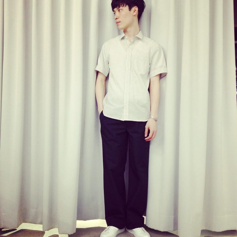 やや着丈の短いバランスには、ゆったりしたシルエットのパンツを。