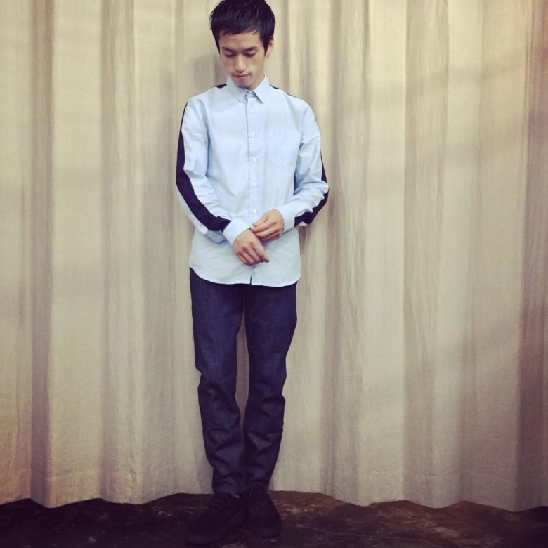 スタンダードなオックスフォードの生地をベースに袖はウール素材に切り替えたラインがアクセントとなるシャツ。