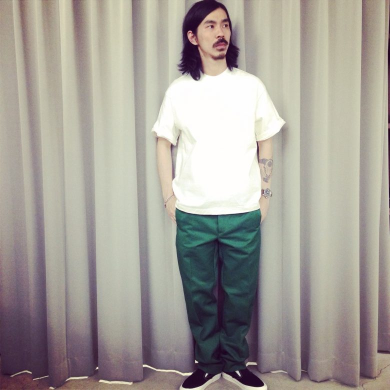 発色の良いグリーンのパンツにはビッグシルエットのカットソーでシンプルに!