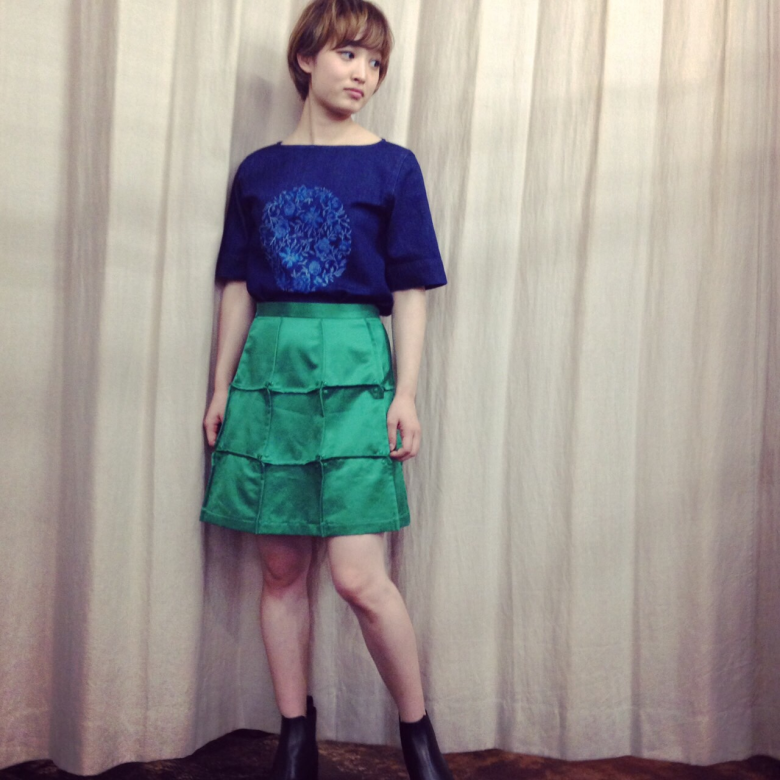 デニム素材のトップスに色鮮やかなスカートでポイントに…
