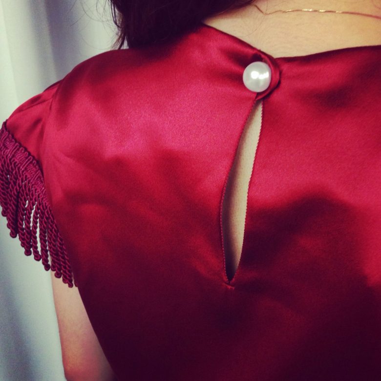 backにはパールボタンが施されており、エレガントな首元を演出。