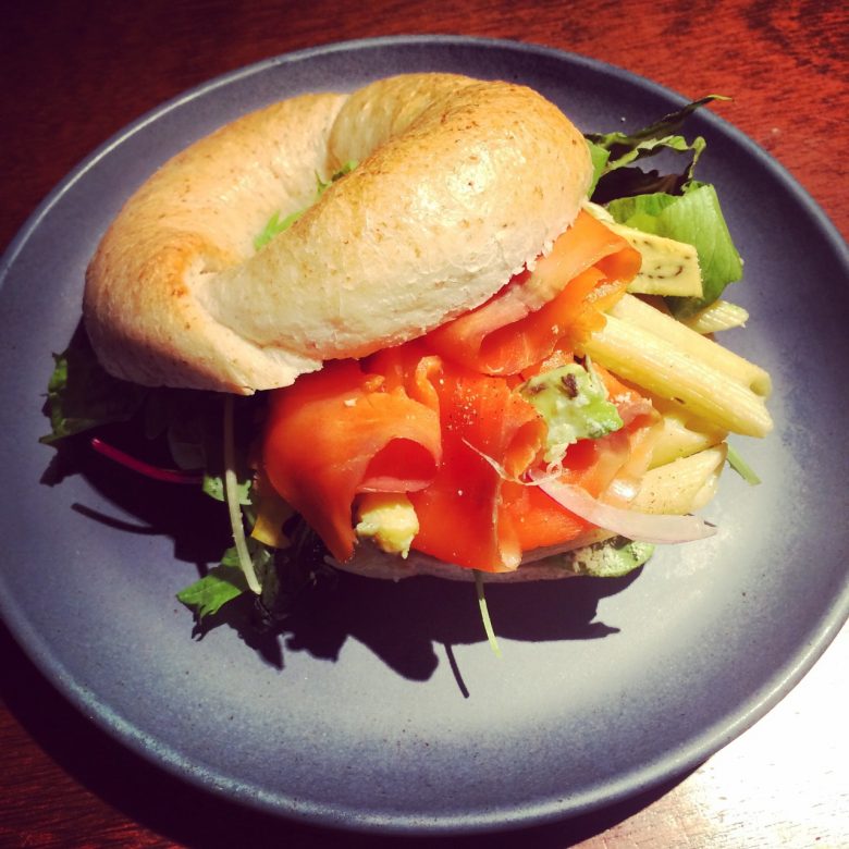 ベーグルプレートはスモークサーモン&ディルクリームチーズ、アボカドのペンネ。