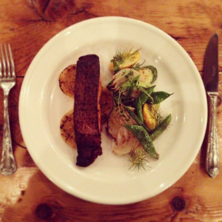 Charcoal grilled salmon spicy lemon marinade with Organic spring Vegetables