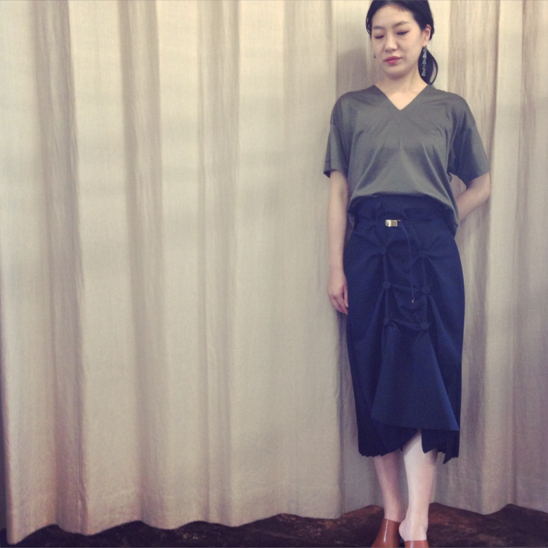 トップスにTシャツを合わせ、綺麗めになり過ぎない落ち着いたスタイリングに。