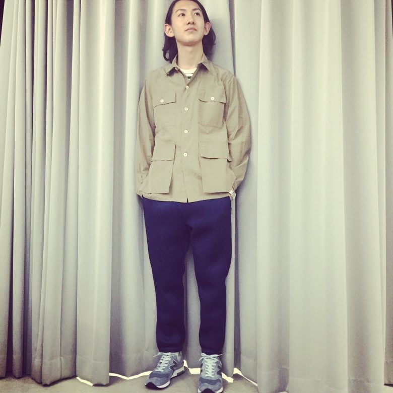 シャツ生地をサファリジャケットのパターンに落とし込むことにより、シャツの上から羽織るアウターとしても、シャツとしても着れる使い回しのきく一着です。