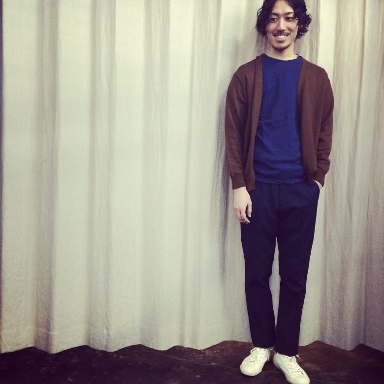 フロントボタンがないリラックスした表情が特徴的なカーディガン。