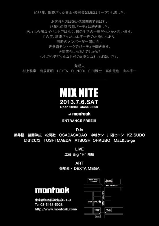 出演:[DJ] 藤井悟, 荏開津広, 松岡徹, OSADASADAO, 中嶋ケン, 川辺ヒロシ, KZ SUDO, はせはじむ, TOSHI MAEDA, ATSUSHI OHKUBO, MaL&Ja-ge, [LIVE] 工藤 Big “H” 晴康, [ART] 菊地昇DEXTA MEGA, [発起人] 村上雅章, 有泉正明, DJ NORI, 白川雅士, 高山竜也, 山本宇一