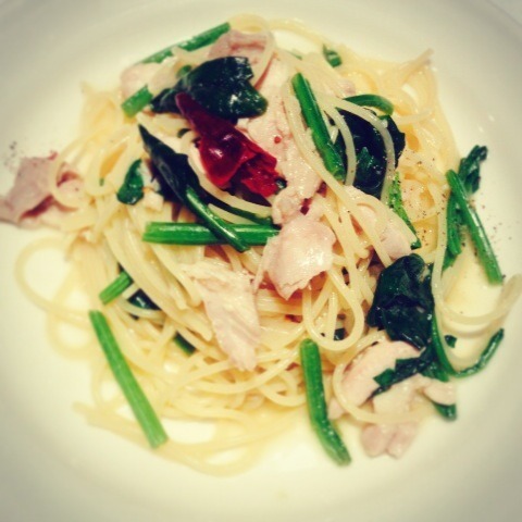 炭焼き大山鷄とちぢみほうれん草のペペロンチーノ