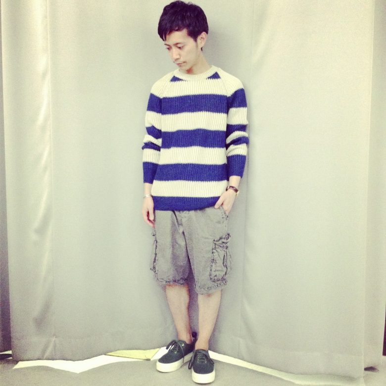 カジュアルになりがちなカーゴショーツには、キレイ目なリネンニットはいかがでしょうか。