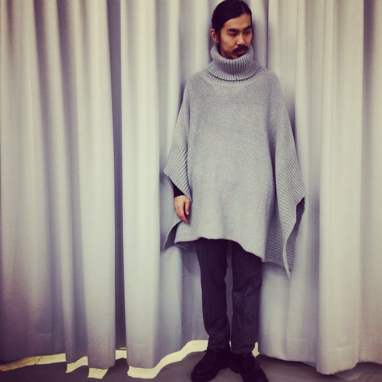 タートルネックのポンチョは羽織りとしても使え、ボリューム感で独特なシルエットを!