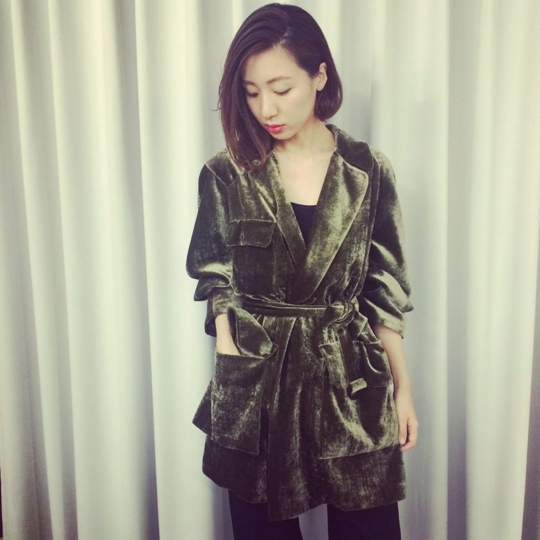 ヴェルベッドの光沢がラグジュアリーでありながらもどこかヴィンテージな雰囲気もあるガウン。