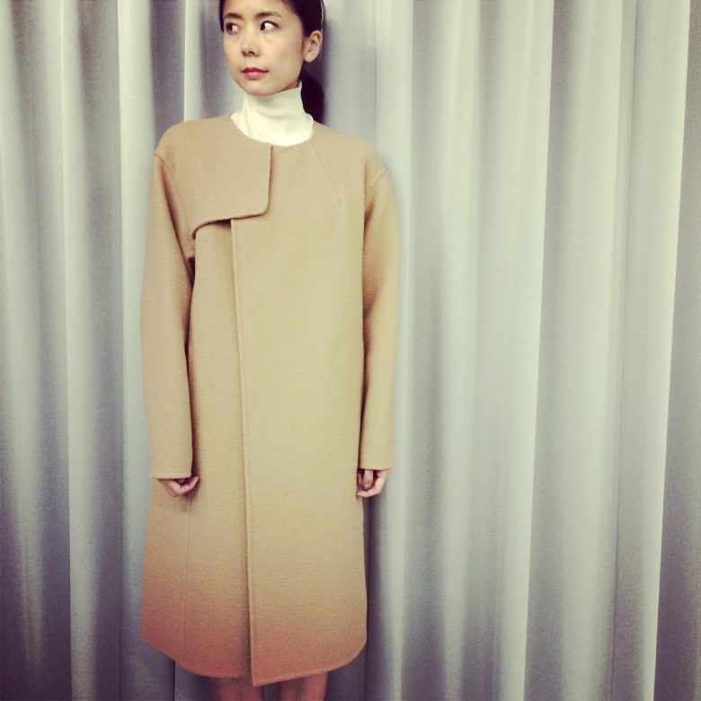 軽くてあたたかい、ダブルフェイスのノーカラーコートは、HYKEのコレクションでも目を引く逸品。
