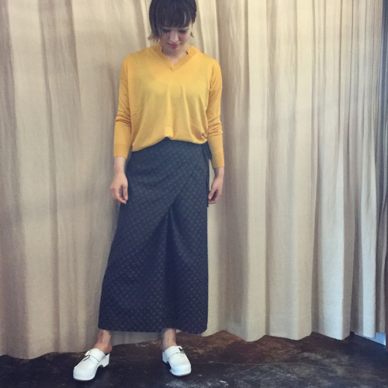 VINTAGEの巻きスカートに、カラーのトップスで合わせるのが