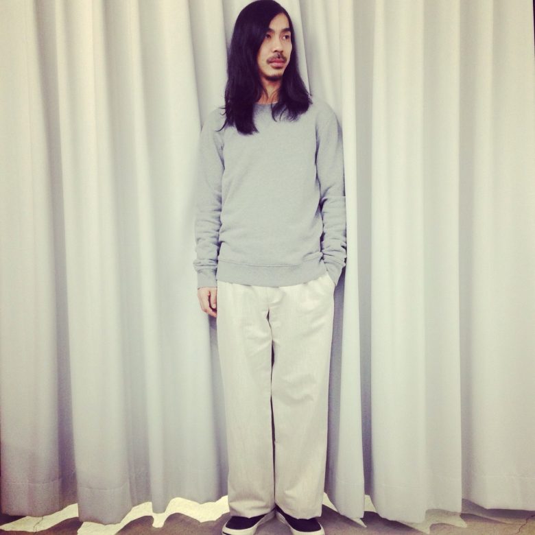 肌触りの良い麻を使用したパンツはシンプルなスタイリングにリラックス感とラグジュアリーな印象をプラス。